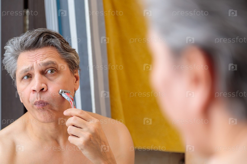 Взрослый седой мужчина бреется бритвой перед зеркалом