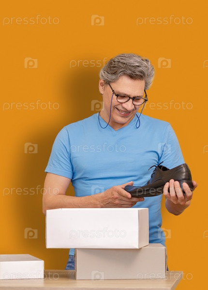 Взрослый седой мужчина доволен покупкой обуви в магазине. Радуется и смеется, положительные эмоции