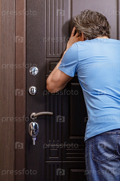 Взрослый седой мужчина смотрит в глазок на входной двери своего дома