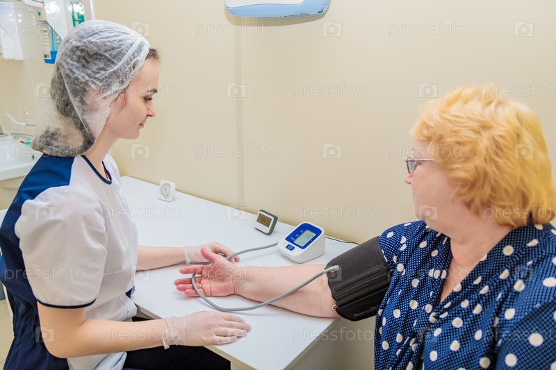 Медсестра в поликлинике измеряет артериальное давление женщине с помощью прибора. Здравоохранение