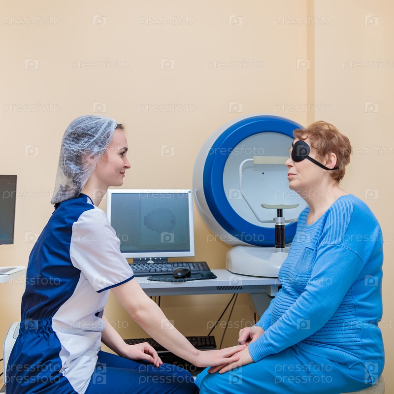 Девушка-оптометрист осматривает глаза пациента с помощью специального современного оборудования