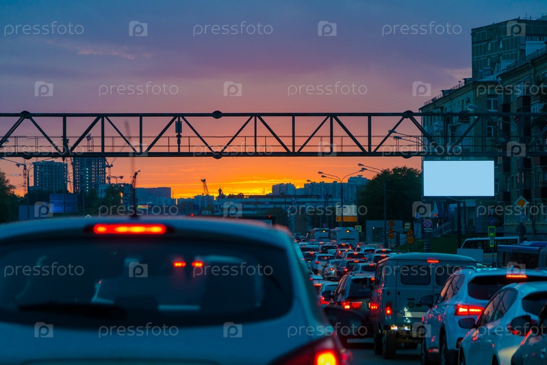 Пробка на дороге вечером на закате летом. Красные огни от фар