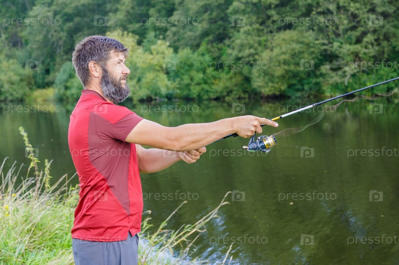 Мужчина с бородой ловит рыбу на реке. Рыбак с удочкой ловит рыбу на берегу реки