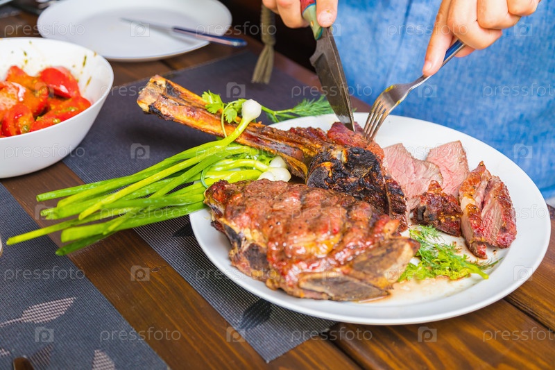 Мужчина режет приготовленное жареное мясо в тарелке. Мясо, запеченное в духовке, на ужин
