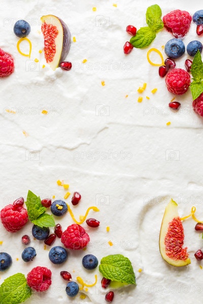 Взбитые сливки из яичных белков с малиной, черникой, гранатом, инжиром