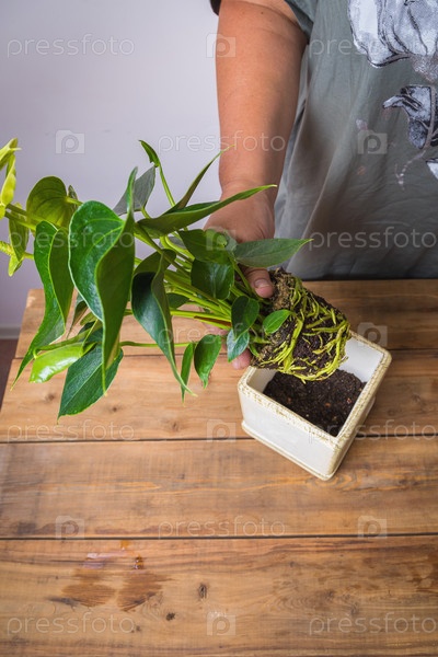 Женщина пересаживает цветок антуриума в квадратный цветочный горшок. Цветоводство,