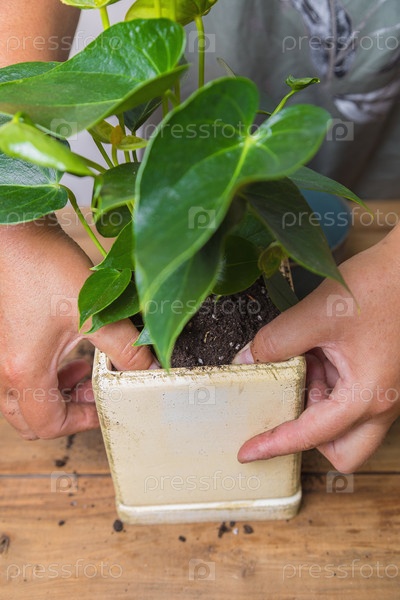 Женщина пересаживает цветок антуриума в квадратный цветочный горшок. Цветоводство,