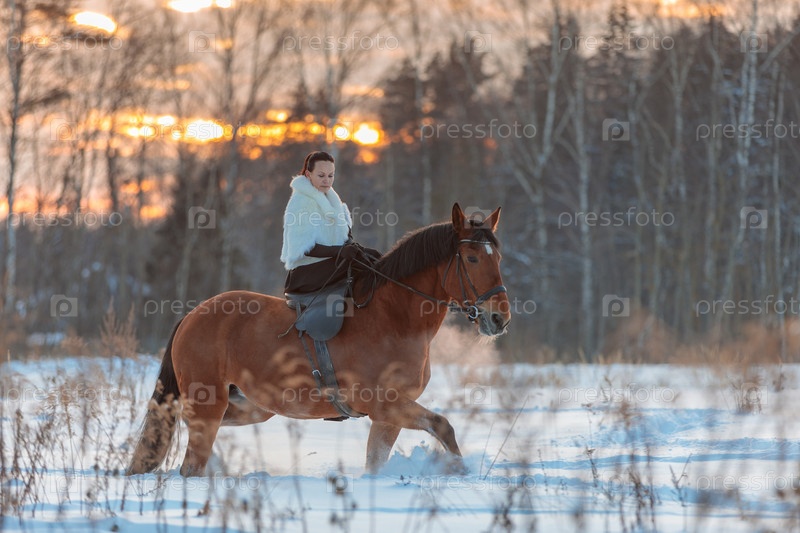 Девушка в белом плаще едет зимой на коричневой лошади. Золотой час, заходящее солнце. Москва, Россия 22 февраля 2021 г