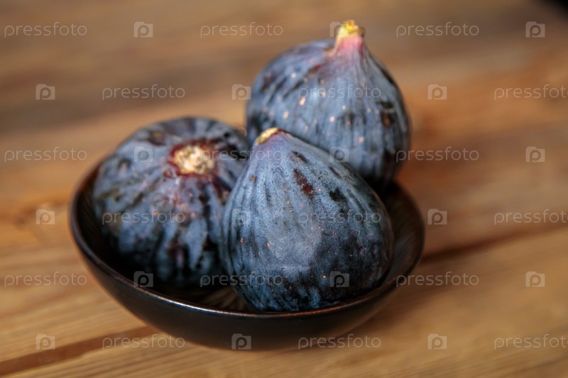 Свежий фиолетовый инжир в миске на деревянном фоне из старых досок. Экзотический сырой инжир. Низкий ключ