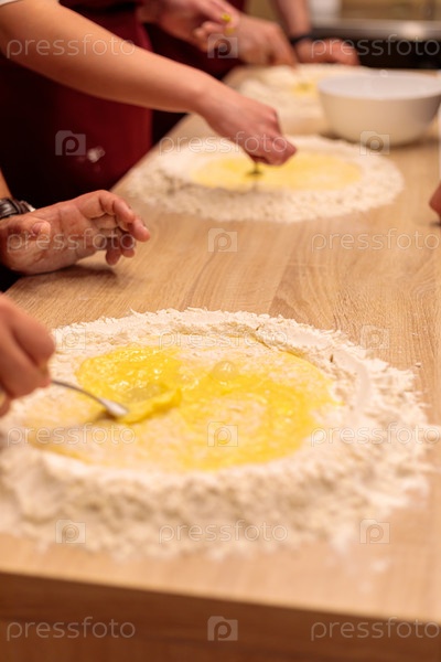 Руки нескольких человек месят тесто на столе. Смешайте сырое яйцо с мукой
