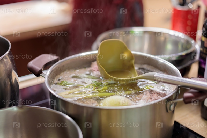 Металлическая кастрюля, наполненная кипящим овощным и мясным бульоном. В бульоне есть ложка
