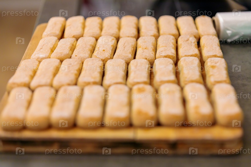 Бисквитное печенье для приготовления тирамису. Савойи выкладываются на разделочную доску. Крупный план