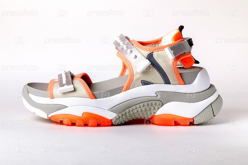 Женские, модные, спортивные сандалии с оранжевыми вставками на белом фоне