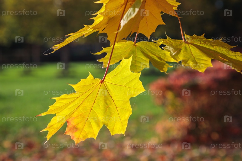 Кленовые желтые листья в осеннем парке. Сезон осень. Крупный план