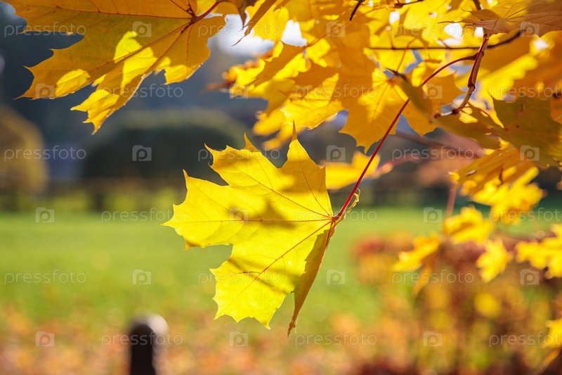 Кленовые желтые листья в осеннем парке. Сезон осень. Крупный план