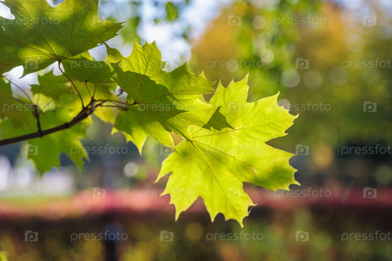 Кленовые зеленые листья в осеннем парке. Сезон осень. Крупный план