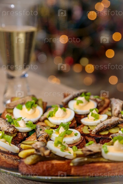 Поджаренный хлеб со шпротами, яйцами и зеленью. Традиционные русские блюда к новогоднему столу