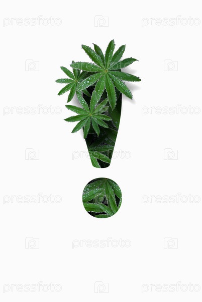 Знаки препинания представляют собой восклицательный знак, выделенный на белом фоне. Стилизован под коллаж из фотографии листа цветка люпина