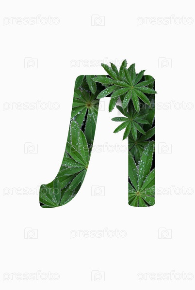 Русская заглавная буква алфавита Л, выделенная на белом фоне. Стилизован под коллаж из фотографии листа цветка люпина