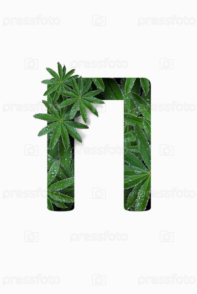 Русская заглавная буква алфавита П, выделенная на белом фоне. Стилизован под коллаж из фотографии листа цветка люпина