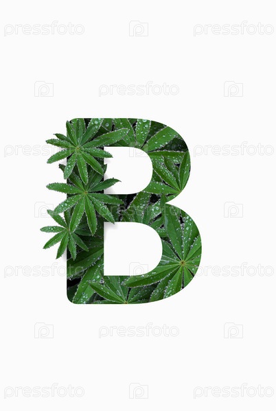 Русская заглавная буква алфавита В, выделенная на белом фоне. Стилизован под коллаж из фотографии листа цветка люпина