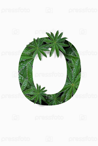 Русская заглавная буква алфавита О, выделенная на белом фоне. Стилизован под коллаж из фотографии листа цветка люпина