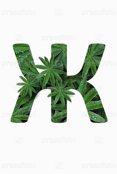 Русская заглавная буква алфавита Ж, выделенная на белом фоне. Стилизован под коллаж из фотографии листа цветка люпина