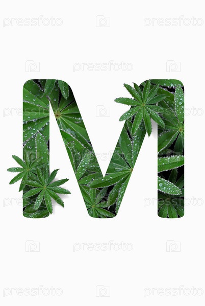 Русская заглавная буква алфавита М, выделенная на белом фоне. Стилизован под коллаж из фотографии листа цветка люпина