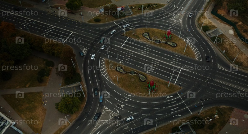 Оживленное городское шоссе. Крупная транспортная развязка. Городской ландшафт. Аэрофотосъемка
