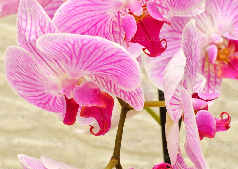 Цветки фаленопсиса (лат. Phalaenopsis) или орхидеи (лат. Orchidaceae) бело-фиолетового цвета
