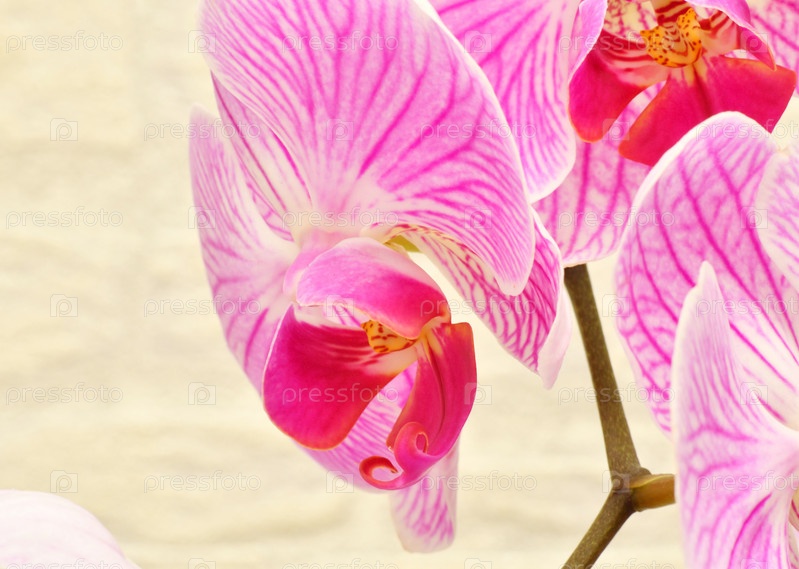 Цветки фаленопсиса (лат. Phalaenopsis) или орхидеи (лат. Orchidaceae) бело-фиолетового цвета