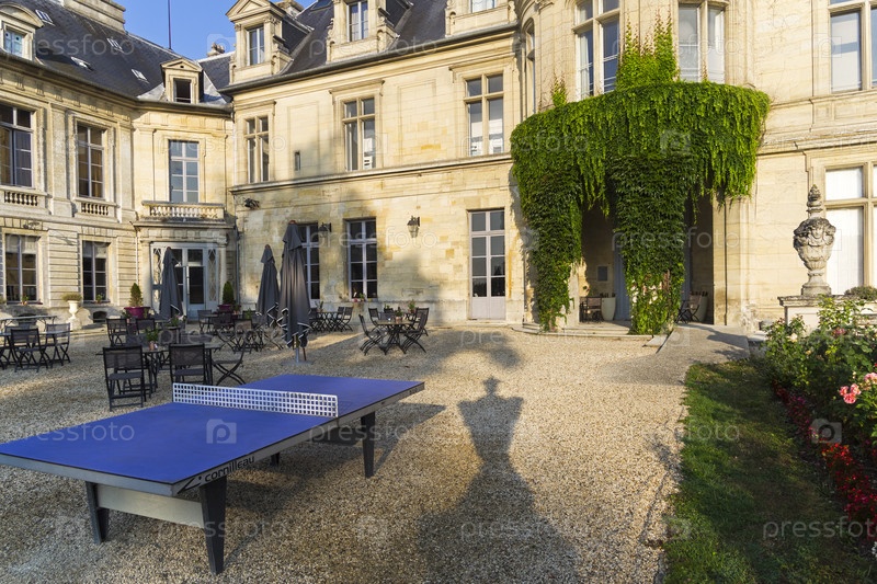 Стол для настольного тенниса во дворе замка Гранд-Мелло, Франция Солнечный день в августе