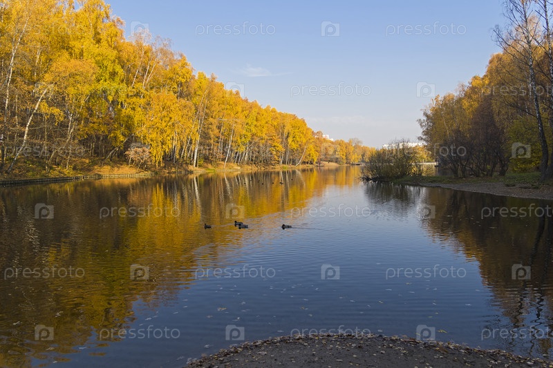 Деревья с ярко-желтой осенней листвой на берегу пруда. Солнечный день в октябре. Ландшафтный заказник Теплый Стан, Москва, Россия