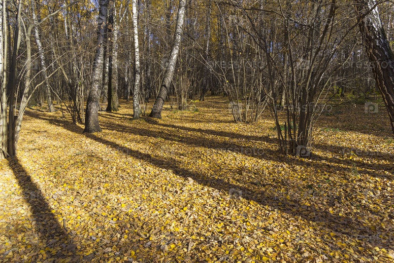 Осень в лесу. Опавшие листья на земле. Ландшафтный заказник Теплый Стан, Москва. Солнечный день в октябре