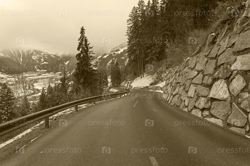 Долина Циллерталь. Вид с горной дороги над поселком Целль-ам-Циллер в сторону горнолыжного курорта Майрхофен. Пасмуреый день в марте