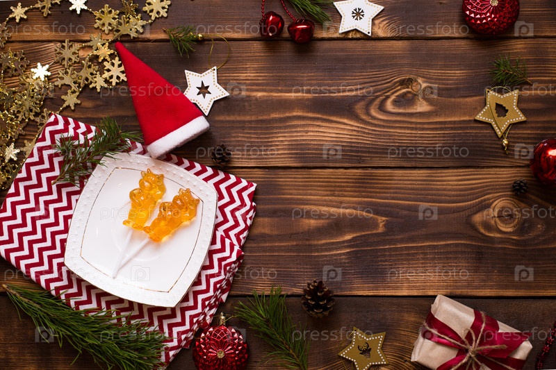 Два леденца на палочке в форме символа нового 2021 года - бык на белом блюдце, полотенце с орнаментом и рождественский декор на деревянном фоне. Ювелирные звезды, бусы, шар, ель. Плоская планировка, пространство для копирования