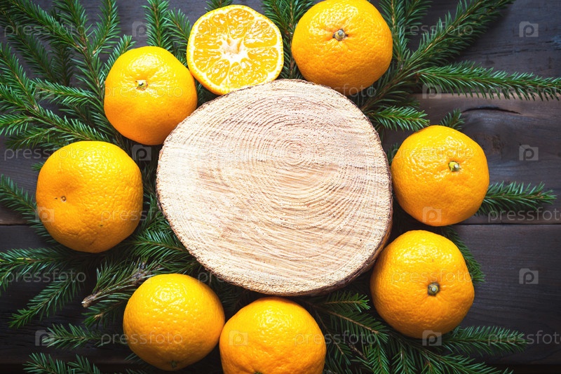 Новогодний праздничный фон на круглом срезе дерева в окружении мандаринов, живых еловых веток и гирлянд из золотых огней, с деревянным пространством для текста. Цитрусовый аромат, дольки апельсина, Рождество. Рамка