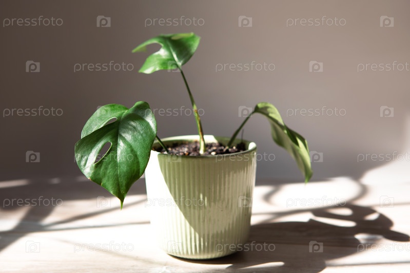 Лист крупного плана Monstera Minima Rhaphidophora TETRASPERMA на подоконнике при ярком солнечном свете с тенями. комнатные растения в горшках, зеленый домашний декор, уход и выращивание