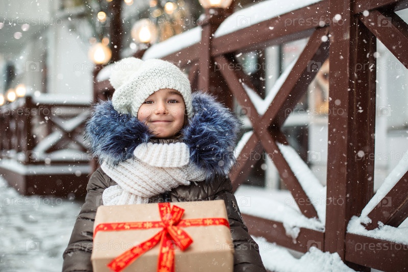 Портрет радостной девушки с подарочной коробкой на Рождество на городской улице зимой со снегом на праздничном рынке с украшениями и волшебными огнями. Теплая одежда, вязаная шапка, шарф и мех. Новый год