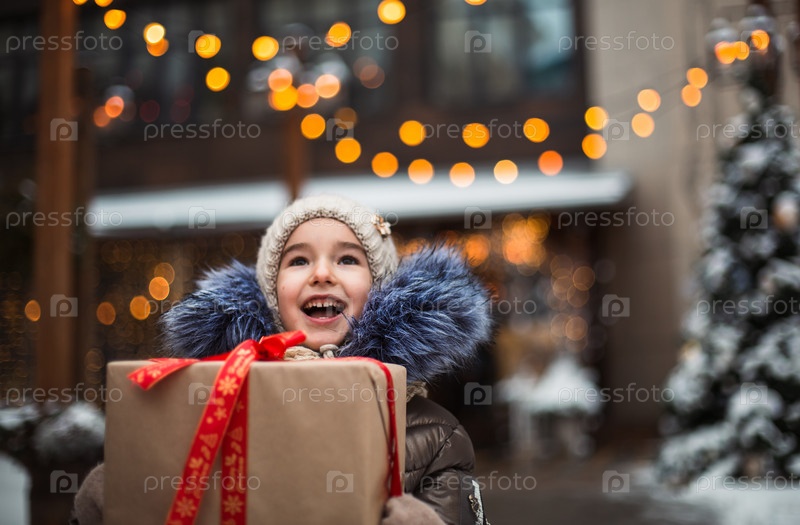 Портрет радостной девушки с подарочной коробкой на Рождество на городской улице зимой со снегом на праздничном рынке с украшениями и волшебными огнями. Теплая одежда, вязаная шапка, шарф и мех. Новый год