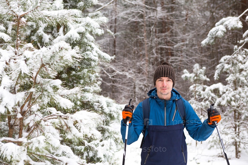 Лыжник с рюкзаком и шляпой с помпоном с лыжными палками в руках на фоне заснеженного леса. Лыжные гонки в зимнем лесу, спорт на открытом воздухе, здоровый образ жизни, зимний спортивный туризм