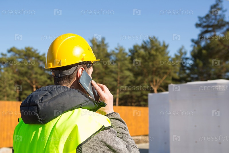 Строитель разговаривает по телефону. Архитектор в защитном желтом шлеме и сигнальном жилете стоит спиной перед строительной площадкой дома с фундаментом и газобетонными блоками