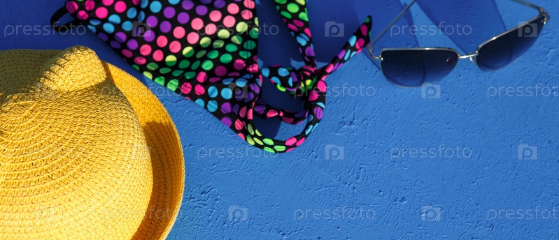 Женские аксессуары для пляжного отдыха на синем фоне. Концепция поездки на море, отдых, купание, защита от ультрафиолета, загар. Туризм и туристическое агентство. Место для текста. Рамка. Флэтлей