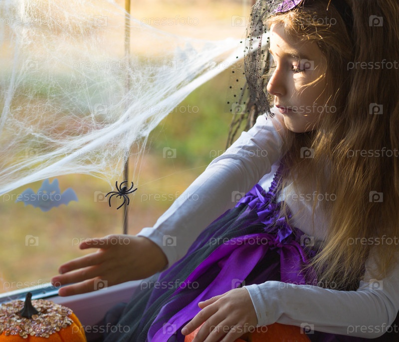 Девушка в костюме ведьмы на подоконнике у окна играет с паутиной и пауком, украшая дом к празднику Хэллоуин. Ужасные пейзажи, страх и ужас, тыквы