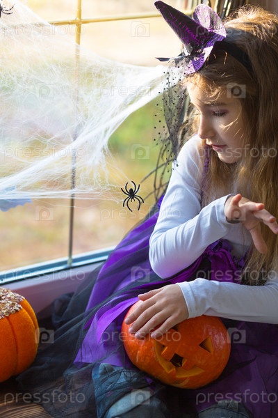 Девушка в костюме ведьмы на подоконнике у окна играет с паутиной и пауком, украшая дом к празднику Хэллоуин. Ужасные пейзажи, страх и ужас, тыквы