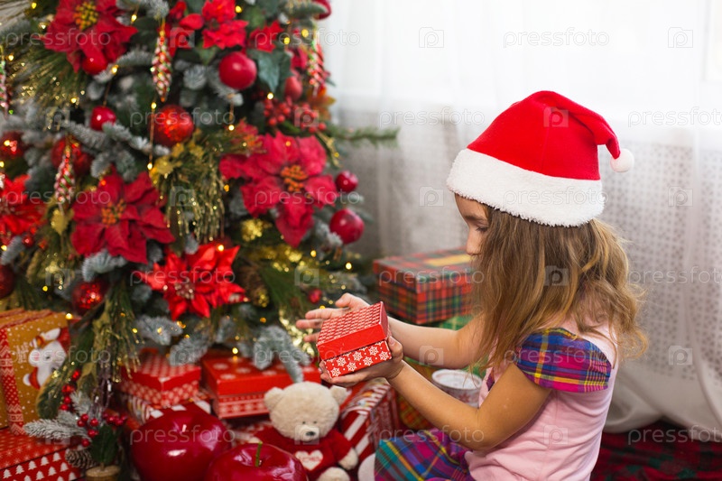 Маленькая девочка в шапке Санты открывает красную коробку с подарком и золотым волшебным светом возле елки. Праздничный декор, пуансеттия на елках, Новый год. Радость, удивление, детские эмоции. Копипространство