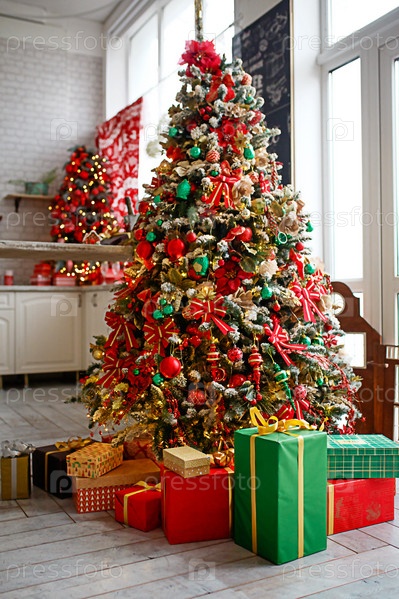 Елка украшена красными и зелеными игрушками, на полу коробки с подарками. Новогодняя атмосфера в доме, праздничный интерьер