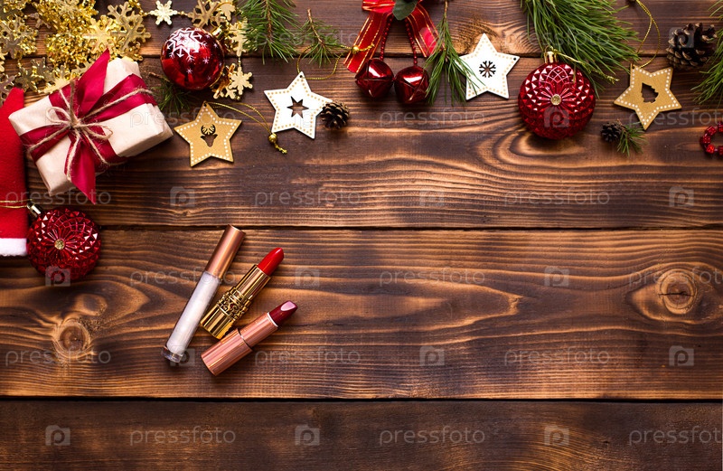 Красная помада и блеск для губ и веки на деревянном фоне в рождественском декоре. Праздничный макияж на новый год, подарок, покупки, женские пожелания. Место для текста, плоская планировка