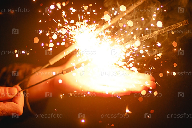 Искры и свет от бенгальских огней в темноте на ладони человека. Рождественская магия, канун Нового года, праздничный фон. Место для текста
