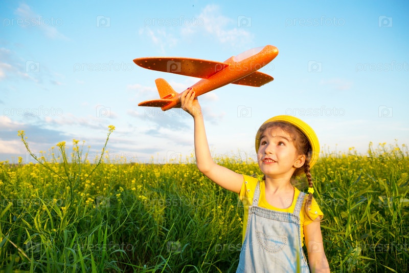 Девушка в желтой панаме запускает в поле игрушечный самолет. Летняя пора, счастливое детство, мечты и беззаботность. Авиатур от турфирмы на путешествие, полет, приключение и отдых